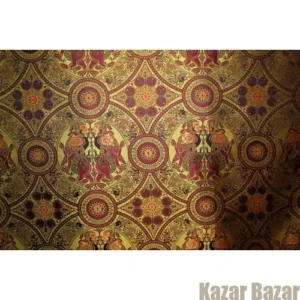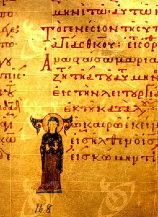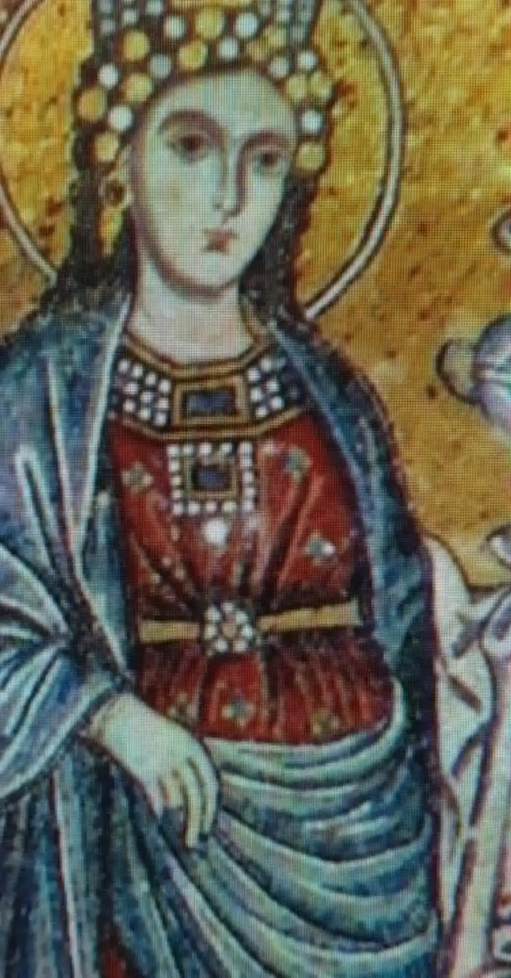 Il s’agit là d’une interprétation personnelle, il est en effet très complexe de distinguer la réelle matière de ces décorations sur les mosaïques et enluminures représentées soit de manière « sommaire » toutes dorées, soit avec des motifs floraux évoqués ou alors lorsqu’elles sont détaillées sur les personnages de plus haut statut faites alors de broderies de perles et de pierreries. De plus, il faut prendre du recul face à l’art byzantin qui use d’un langage symbolique, pas forcément réaliste. Ce personnage étant noble mais de petite noblesse , l’usage du brocard semblait une alternative convenable dans la mesure où l’Empire byzantin était producteur de ce type d’étoffe.