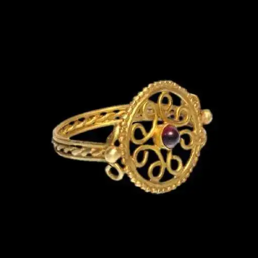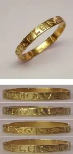 Anneau d'or gravé :  'AVE MARIA GRACIA PLENA'. La typographie de type Lombarde la situe fin XIIè/début XIIIè siècle