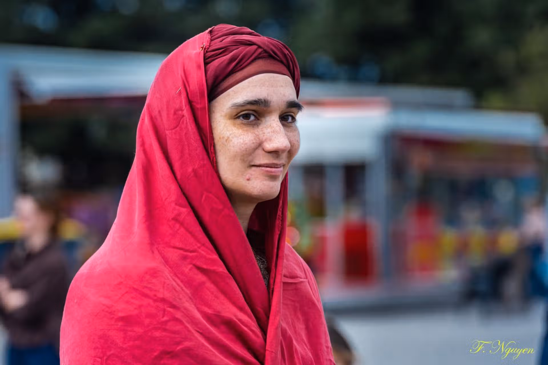Le couvre chef d’Eudoxia est un voile en crêpe de soie translucide rouge foncé sur lequel vient reposer sa chlamyde (grand châle typiquement byzantin) en soie diamantée rouge. Il s’agit là d’étoffes légères, au drapé fluide, pour s’approcher des rendus présents sur les iconographies tout en étant des étoffes riches, en adéquation avec son statut social. Crêpe de soie de chez Stragier et soie diamantée de chez Sartor, mais les dames de cour vous le confirmeront, les ourlets eux sont faits main, tout comme ses sous-vêtements (une chainse de lin blanc), par la maîtresse elle-même qui semble trouver aux travaux d’aiguille des bienfaits méditatifs (chacun sait qu’il n’est guère recommandé de troubler ces moments d’introspection sous peine de vives remontrances !).