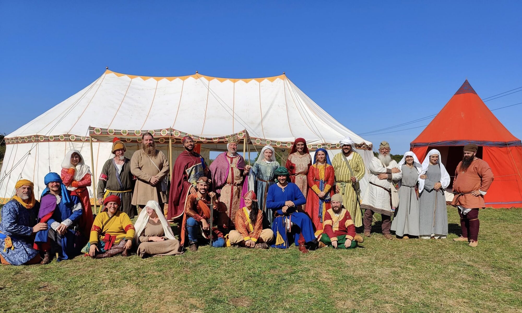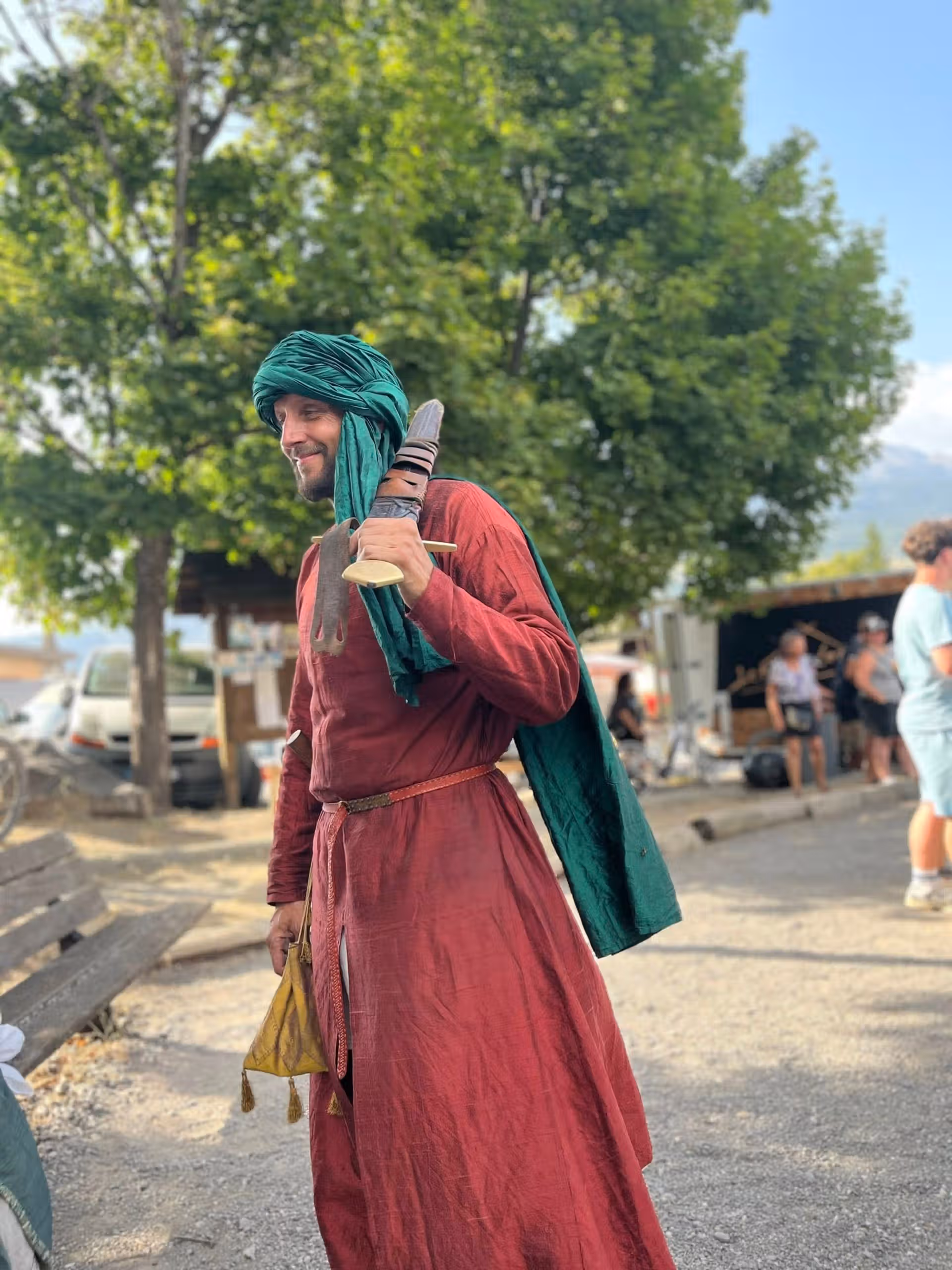 Caftan en soie avec bandes à tiraz, sarouel, chainse courte en lin, grand turban en soie ou sharbush, bottes en cuir, sash; ou bien la longue cotte en soie rouge, fendue à l’entrejambe, les braies et les chausses en soie, les chaussures basses en cuir et la ceinture occidentale en cuir